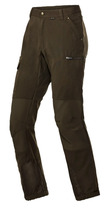 Pointer Chevalite Pants Men 3.0 ist eine leise und geschmeidige Shellhose aus gebürstetem Stretchmaterial. Sie ist für die Jagd und andere Outdoor-Aktivitäten ausgelegt. Die Konstruktion ist wasser- und winddicht dank unserer Chevalite-Membran und der verschweißten Nähte. Kontrastierende Verstärkungen an den Beinvorderseiten und -abschlüssen. Die Pointer 3.0 Jagdhose ist hinten höher geschnitten und schließt gut am Rücken ab. Dadurch vermeiden Sie Zugluft am Rücken, wenn Sie sitzen oder in schwierigem Gelände klettern. Öffnungen mit Reißverschluss sorgen für Belüftung an der Außenseite der Hosenbeine. Die Hose ist mit Gürtelschlaufen und Knöpfen für die Hosenträger ausgestattet. Die Hose Pointer 3.0 hat praktische und gut durchdachte Taschen, wie die mit Fleece gefütterten Handwärmertaschen und die geräumigen Beintaschen an beiden Beinen. In der rechten Beintasche befindet sich eine Handytasche aus Mesh, in der linken ein elastischer Patronenhalter. Die Hose ist ergonomisch geschnitten, mit abgewinkelten Knien, und unterhalb der Knie wie an den Beinabschlüssen verstellbar. Außerdem befindet sich innen an den Beinabschlüssen ein Haken zum Befestigen der Stiefel, damit die Hose nicht hochrutscht. Das Hauptmaterial und die beiden Futterstoffe sind aus recyceltem Polyester hergestellt.